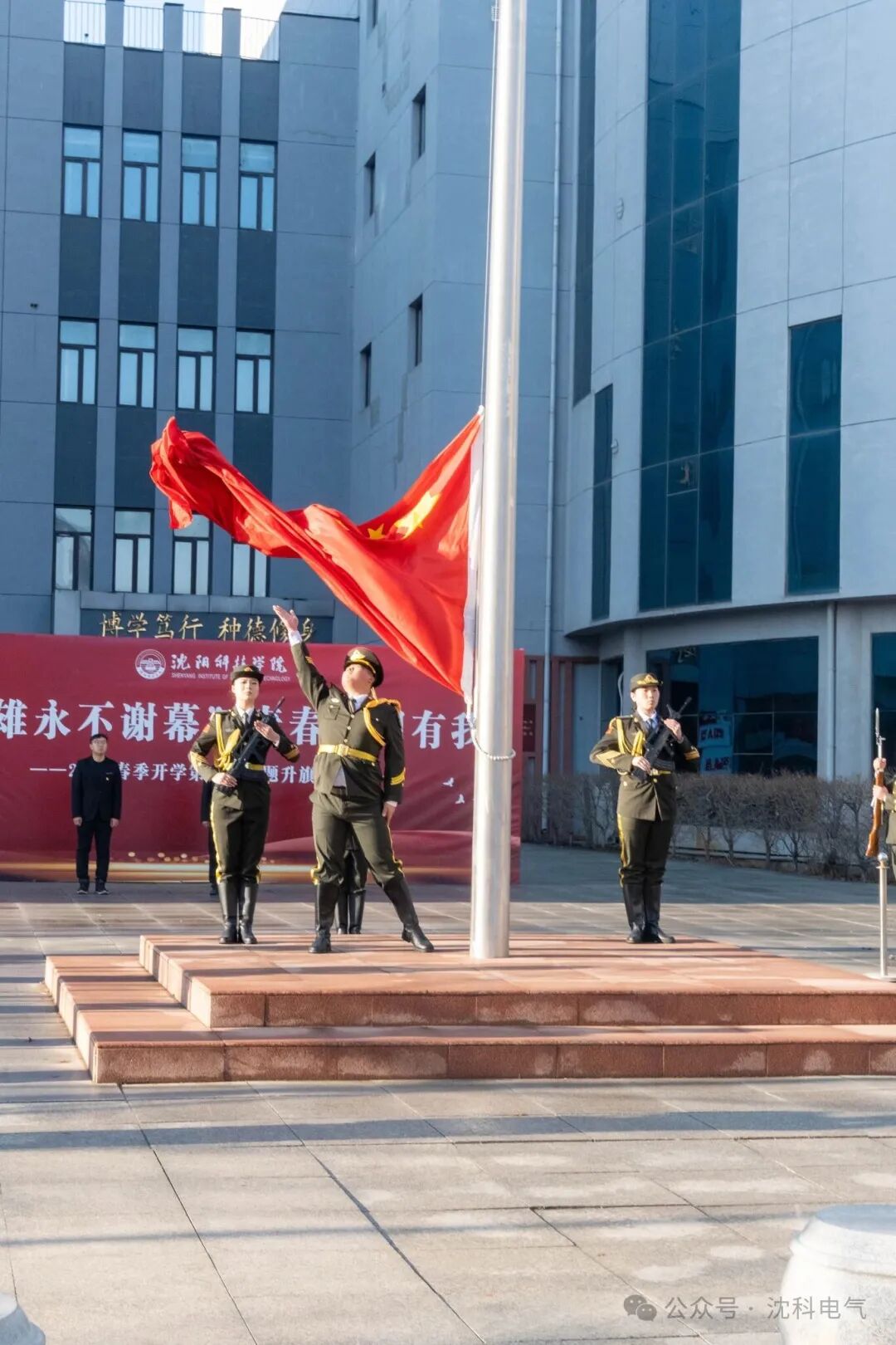 最后,院长李晓波围绕三方面,为全体同学上了一堂特殊的思政课,第一,要坚定理想信念,厚植家国情怀。希望同学们爱党爱国,始终坚守着这份勇毅前行的初心,心怀“国之大者”,做好“眼前小事”,在沈科校园里走好社会生活的第一步,让青春在实现中华民族伟大复兴的壮美事业中,在沈科的校园里绽放绚丽之花,努力成为一名有家国情怀、有温度的沈科电气人。第二,要砥砺道德品格,涵养静气定力。希望同学们在沈科心无旁骛求知问学的同时,能够明德、修德、学德、守德,坚守道德法则,成就精彩人生,积极践行社会主义核心价值观,争做德才兼备的新时代大学生,努力成为一名有道德修养、有风度的沈科电气人。第三,要赓续奋斗之志,矢志夯基提能。希望同学们立鸿鹄志,做奋斗者,练真本领,刻苦学习专业技能知识,勤于实践,勇于创新,用奋斗绘就大学生活的底色,用超越书写青春岁月的诗篇,在磨砺中不断成长,努力成为一名有远见卓识、有气度的沈科电气人。升旗仪式在校歌《大路阳光》歌声中落下帷幕。